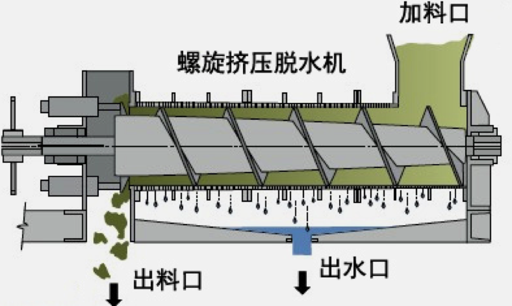 ®其组成部件包括右法兰、反冲洗驱动电机、出料口、顶部连轴器、顶部轴承、锁紧螺帽、倒三角挤压锥、外壳、螺旋叶片、螺旋轴、出水口、左法兰、底部支架、驱动减速装置、底部连轴器等。